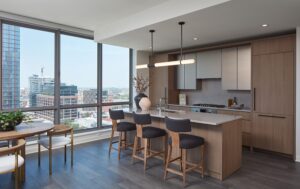 Designed by Morris Adjmi Architects, a firm known for its contextual work in and around historic areas such as New York’s Meatpacking District, The Row is a reflection of its immediate surroundings. The exterior features a deeply expressed dark metal facade as a nod to Fulton Market’s industrial past, and the curved gusset beams in upper corners of the window wall system mirror the supports beneath the nearby ‘L’ tracks. These architectural features are not only visible from the street, but also from within many of the residences, framing the views of the city beyond. The Row marks Related’s fourth collaboration with Morris Adjmi Architects nationwide and second in Chicago.