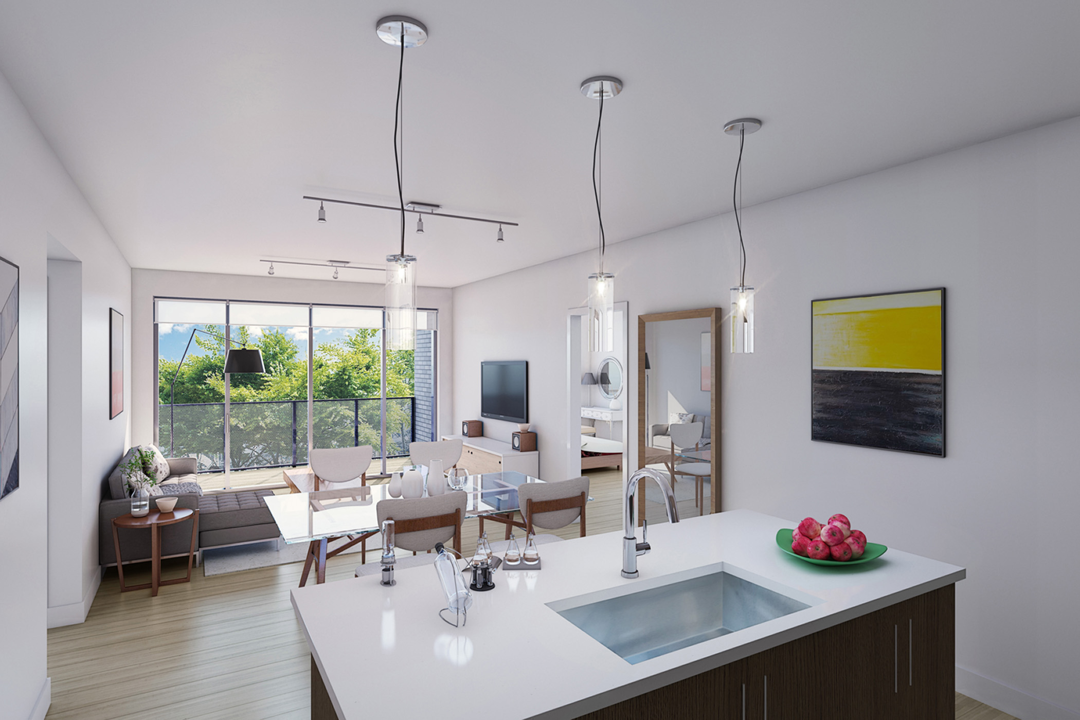 Floor plans at 1620 Central measure 601 to 1,297 square feet and include one-, two-, and three-bedroom apartments ranging from $2,020 to $3,287. Every residence features an in-unit washer/dryer and private outdoor space. Condo-quality touches at 1620 Central include 9-foot ceilings, luxury plank flooring and a key fob entry system. The residences also feature stainless-steel appliances, sleekly-styled cabinets and quartz countertops in the kitchen, as well bathrooms appointed with a soaking tub and quartz-topped vanity. Hallway markers and residence numbers are called out with sophisticated wood and metal signage.