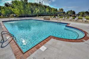Evergreen Luxury Apartments Outdoor Pool and Sundeck: Evergreen Luxury Apartments in Merrillville, Ind., now managed by RMK Management Corp., offers a host of on-site amenities, including an outdoor pool with sundeck as well as a fitness center, clubhouse, tennis court and sand volleyball court.