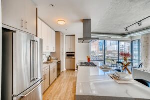 Sienna Chicago Kitchen – Kitchens in each residence at Sienna Chicago include 10-foot exposed concrete ceilings, quartz countertops, high-end appliances, and European-style frameless kitchen cabinets with a duo-tone finish.
