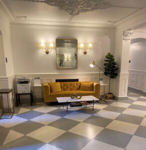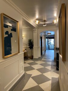 The Oliver on LaSalle Lobby: The Oliver on LaSalle, now managed by RMK Management Corp., is a vintage rental building in Chicago’s Old Town neighborhood, originally built in 1924. The lobby features original design details, including a marble entry, tile patterned floor and ornate ceiling relief.
