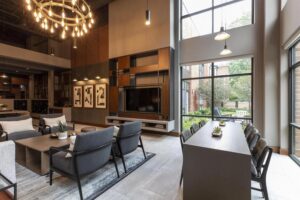The Raven Residences Game Room: The Raven Residences, a 167-unit luxury multifamily community in Chicago’s Ravenswood neighborhood, offers a host of on-site amenities, including a game room with a bar/entertainment kitchen area, a pool table and TVs.