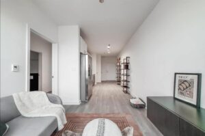 All residences feature plank-style flooring; kitchens with quartz countertops, two-tone cabinetry, subway tile backsplash and stainless steel appliances; oversized closets with built-out shelving systems; and in-unit laundry. Select units also have private terraces.