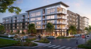 Tempo Nine Mile Station NE Corner (Rendering)_Credit KTGY: Tempo Nine Mile Station, a new five-story mixed-use development at the northeast corner of Parker Road and Peoria Street in Aurora, Colo., will be ready to begin welcoming first residents Feb. 1. The rental property is a joint venture of Chicago-based Draper and Kramer, Incorporated, Koelbel and Company, Mile High Development and Urban Roots Development, Inc.