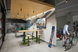 Tempo Nine Mile Station_Colorado Room (Rendering)_Credit KTGY: Tempo Nine Mile Station’s robust package of interior amenities includes a “Colorado Room” with bike, ski and kayak storage as well as equipment maintenance stations.