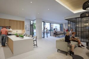 Tempo Nine Mile Station_Resident Lounge (Rendering)_Credit KTGY: A resident lounge at Tempo Nine Mile Station offers shared space for socialization as well as coworking.