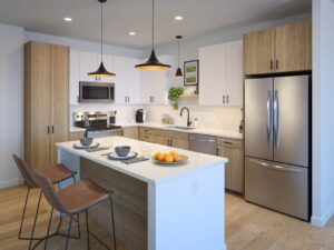 Tempo Nine Mile Station_Unit Kitchen (Rendering)_Credit KTGY: Residences at Tempo Nine Mile Station are outfitted with modern, upscale finishes, including contemporary kitchens with wood-grain cabinets, stainless steel appliances, subway tile backsplashes, quartz countertops and black hardware.