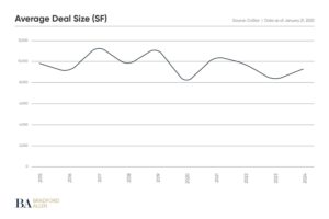 The average office lease size has been relatively steady in downtown Chicago on an annual basis, ranging from 8,000 to 10,000 square feet in recent years.